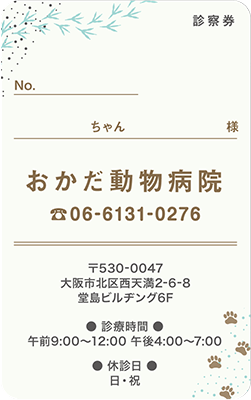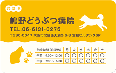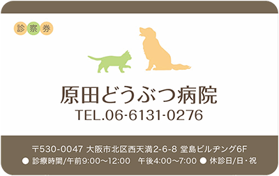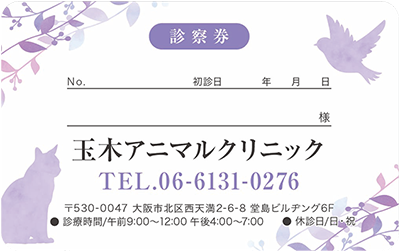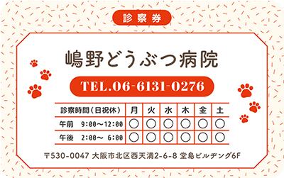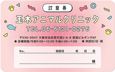 ビジュアルやレイアウト、或いはイラストなどで表現することが難しい診療科の一つである動物病院。私たち「みんなの診察券」では、前述のようなデザインを、作成時に診察券そのものの機能を考え、より機能的な側面を配慮したデザインテンプレートを提案しています。
